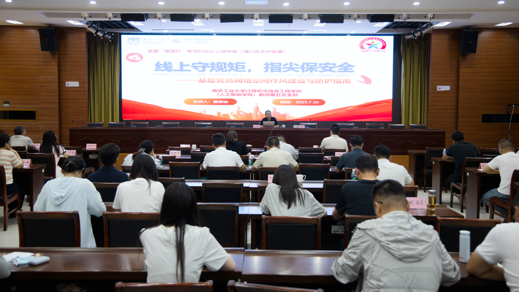 7月30日下午,应南京浦口区永宁街道党工委邀请,伟德国际1946bv官网员工第五党支部书记景朋森,在永宁街道“周三学习日”活动中,为街道领导班子成员、机关科室负责人及村(社区)书记等150余人,作题为“线上守规矩,指尖保安全——基层党员网络空间作风建设与防护指南”的专题培训。