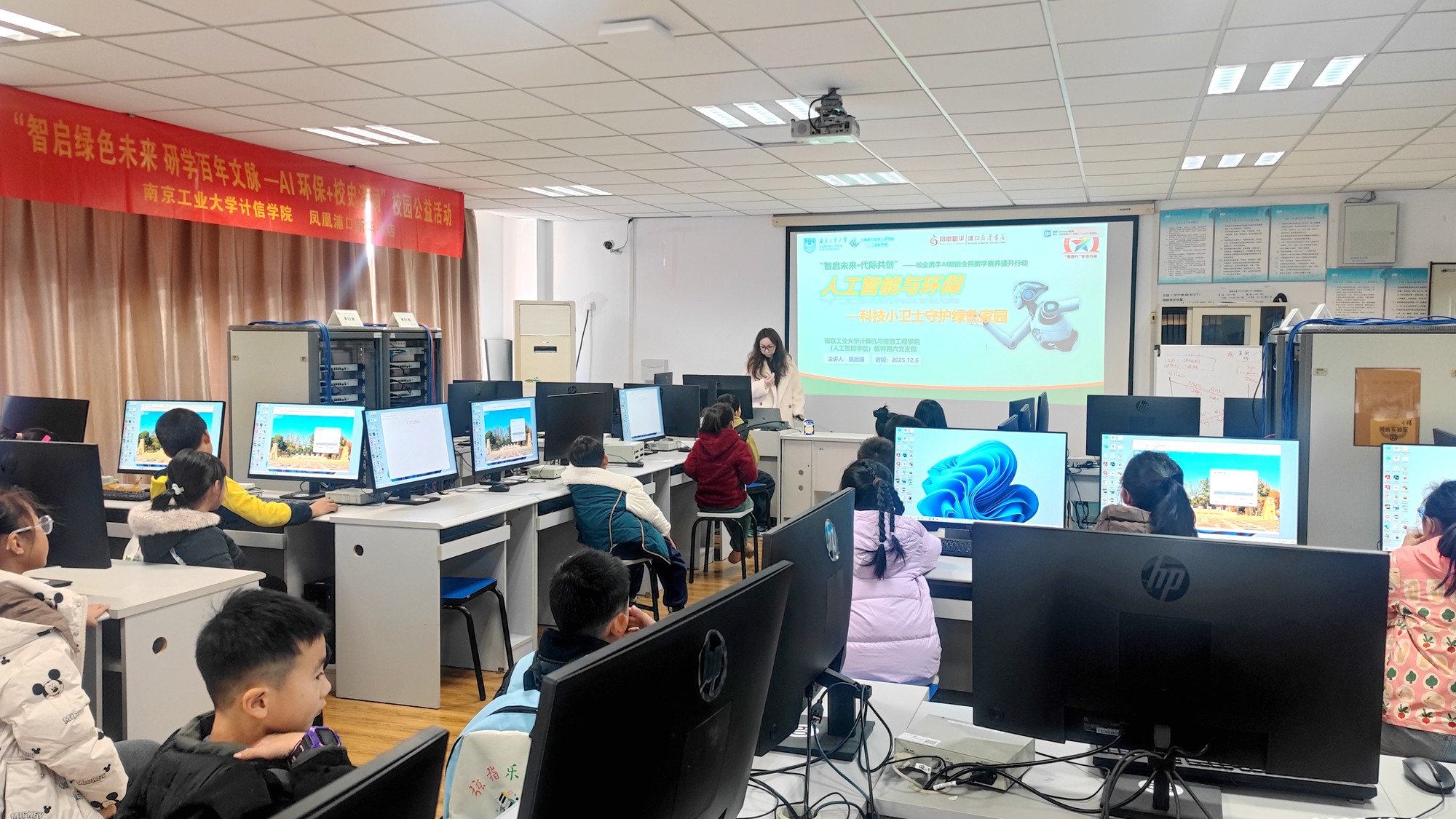 活动伊始,崇德楼A511实验室里,员工第五党支部书记景朋森介绍了活动背景及流程。随后,员工第六党支部姚旭婧以《疯狂动物城》生态危机为切入点,开展“人工智能与环保——守护绿色家园”公益讲座。她结合雾霾、水污染等现实问题,生动讲解AI在污染监测、垃圾处理、生态保护等领域的应用,从水质智能检测、垃圾分拣到野生动物识别,让小读者直观感受科技护绿力量,激发环保热情。