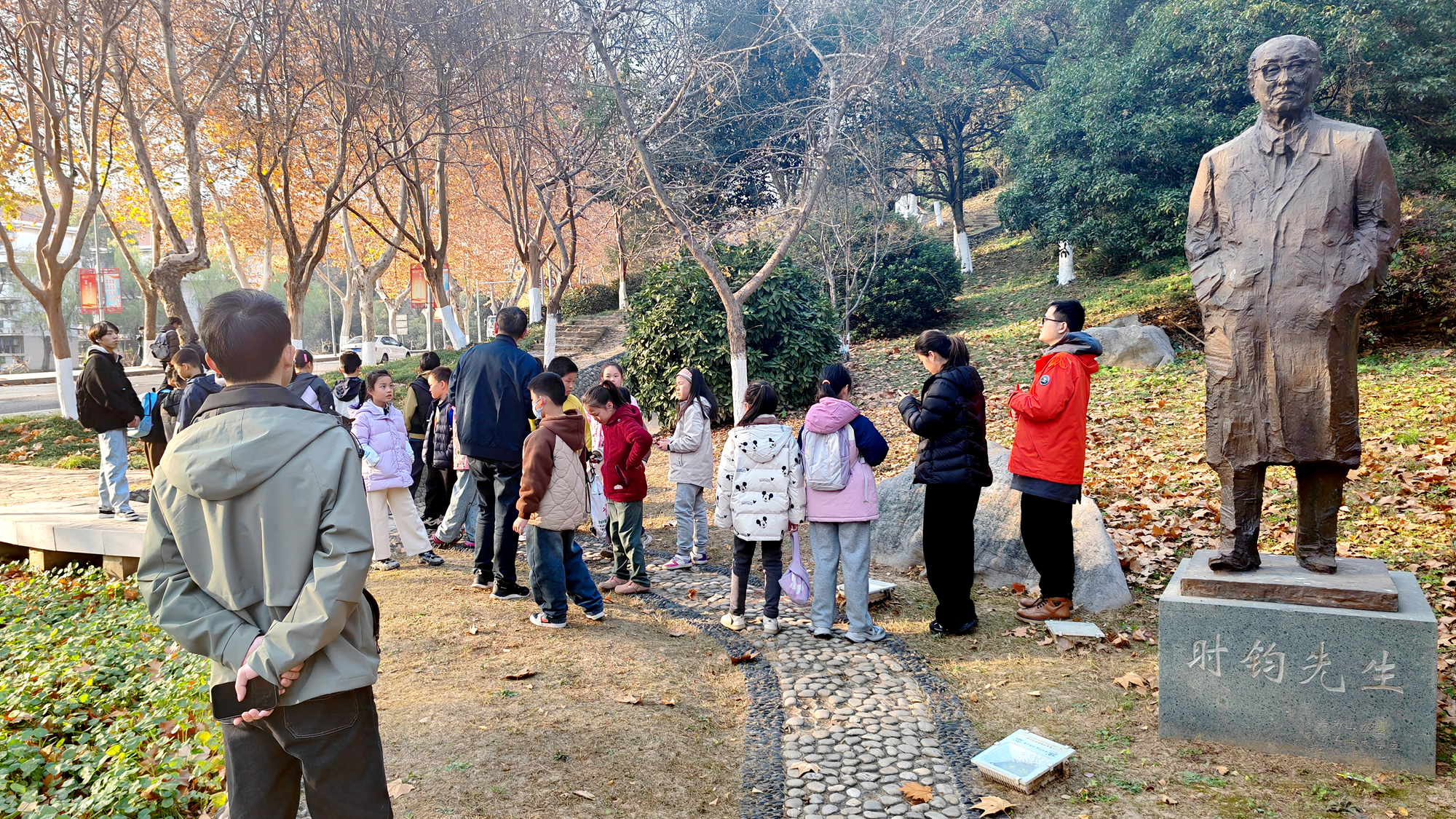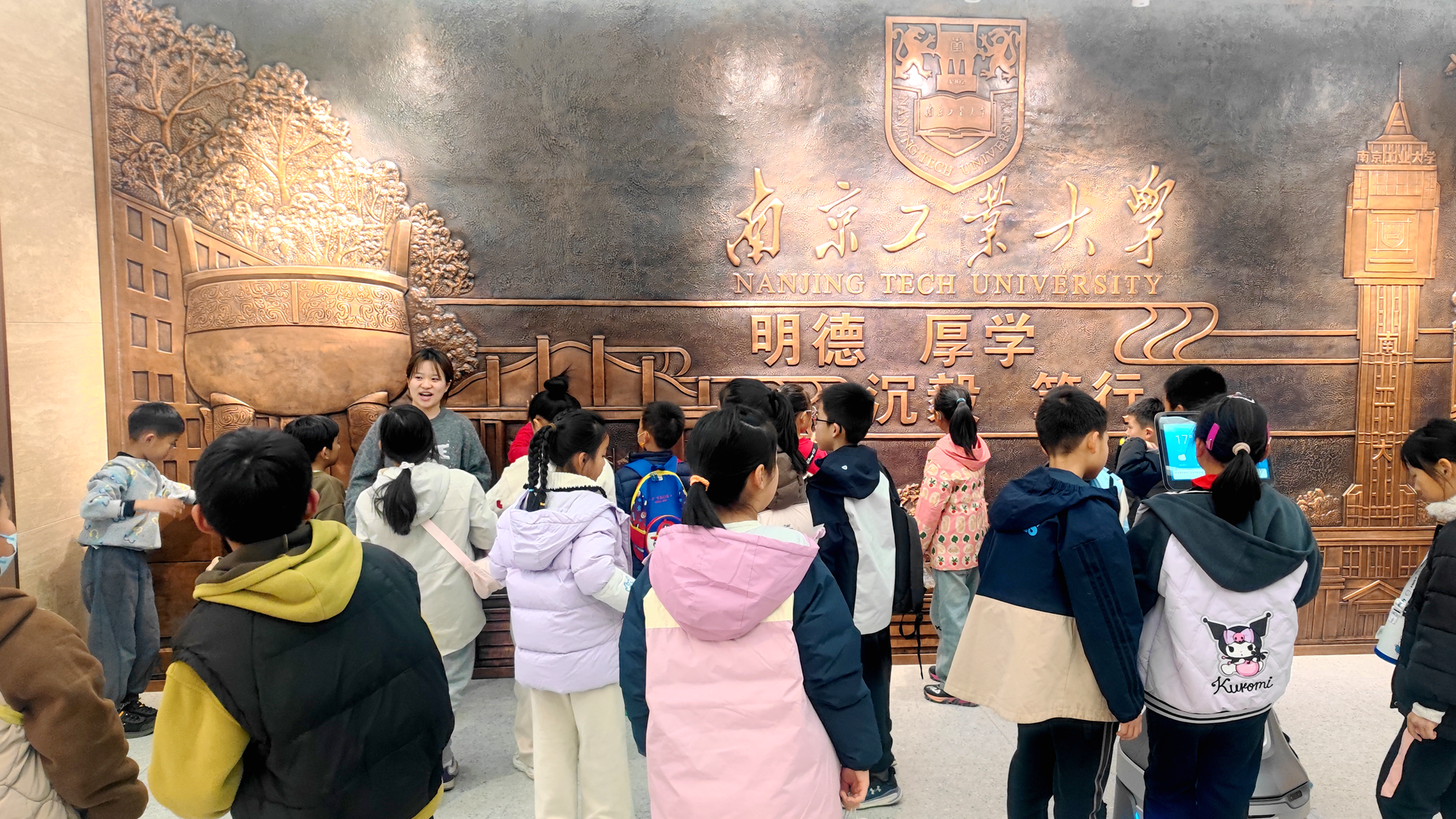 在大员工志愿者带领下,小读者们先后参观时钧园、打卡工大水塔,最后走进校史馆。讲解员引导大家深入了解校史馆、时钧馆、欧阳平凯纪念馆内涵,感受学校123年办学历史与“明德、厚学、沉毅、笃行”校训精神,体悟产学研协同创新特色。